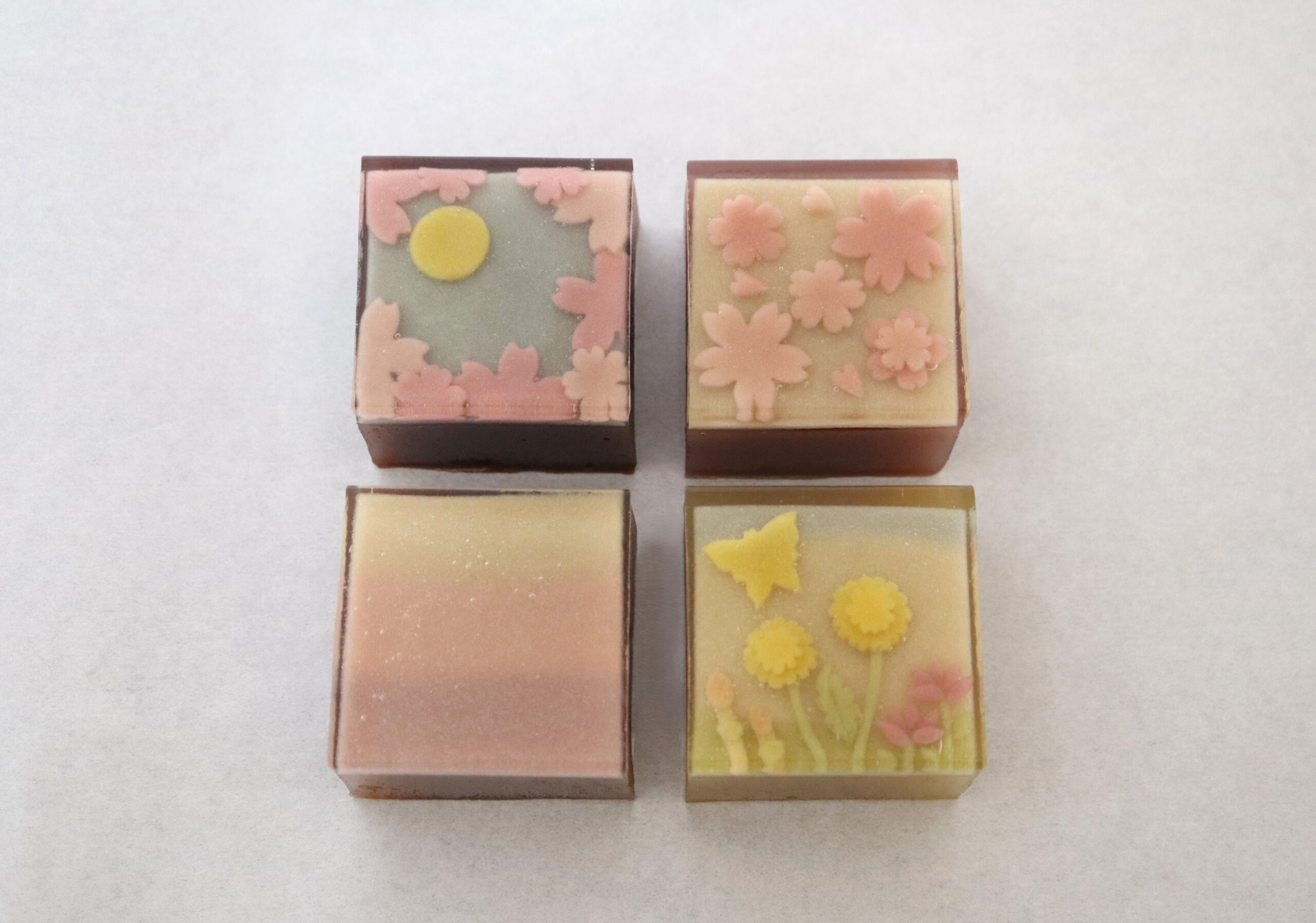 春爛漫の景色を羊羹に映してお届けしたいなと考えて早2年。なかなかお作り出来るタイミングが合わなかったのですが、ようやく叶いました。せっかくなので色々な羊羹を楽しんでいただけたらと思い、全て違うお味でお作りさせていただきます。